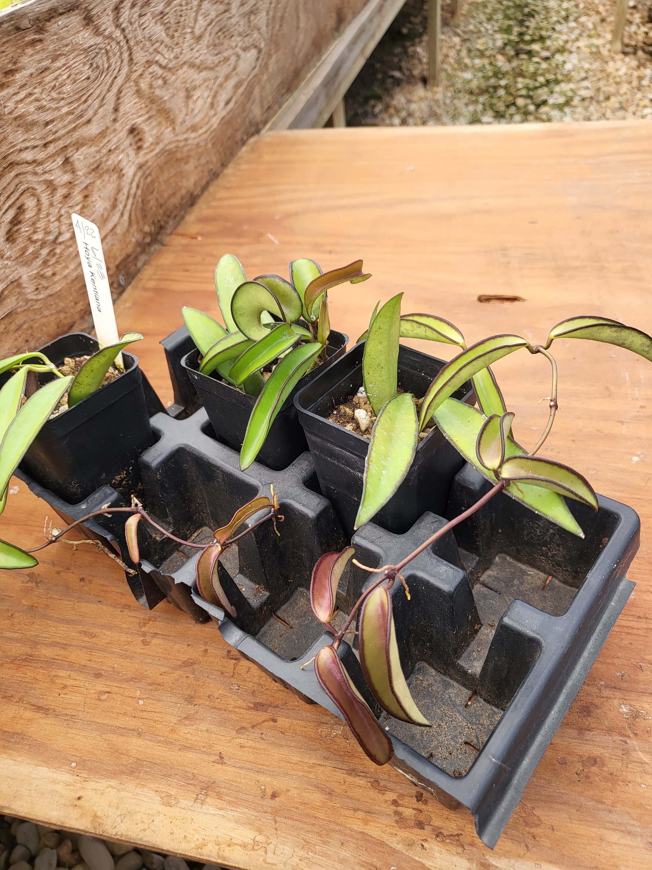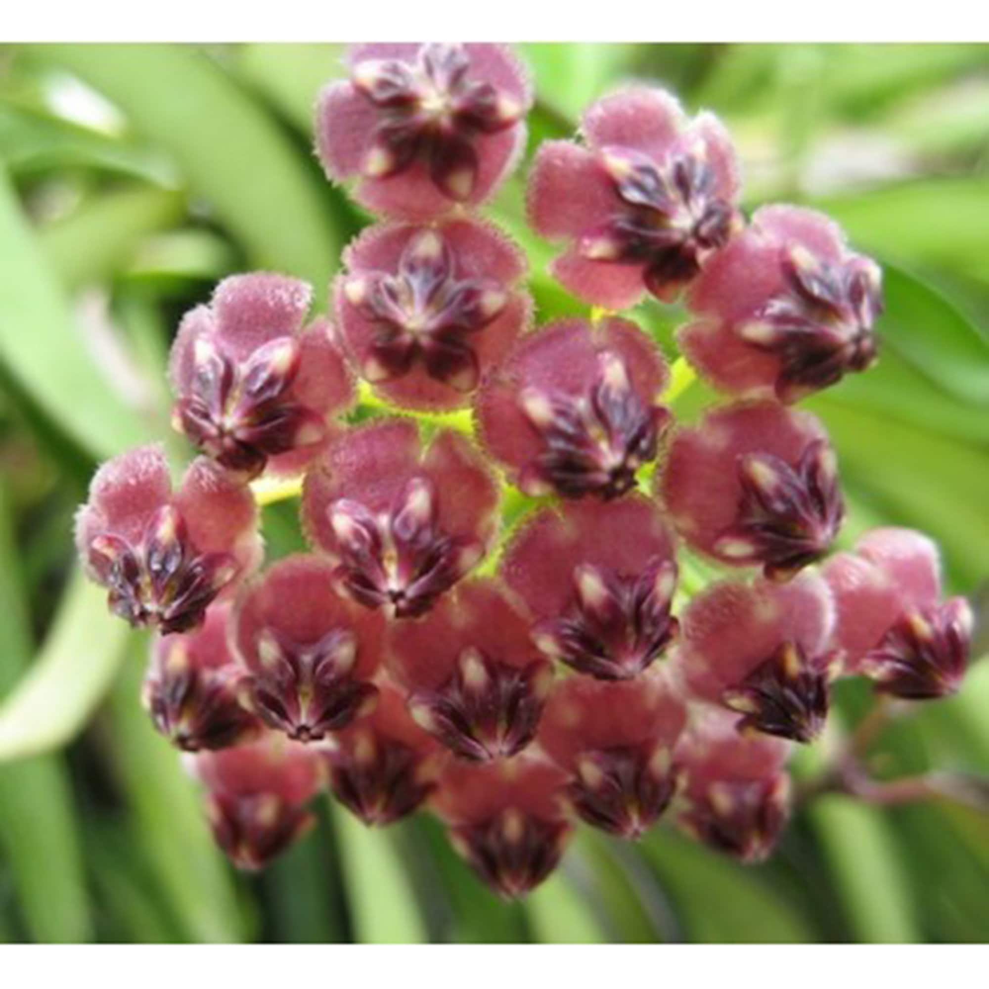 Hoya kentiana is very similar to Hoya wayetii only the butterscotch fragrant flowers are slightly different, wayetii umbels are darker, larger and more purple in color. Hoya kentiana is a very strong grower and is suitable for a beginning hoya grower. It does best as a hanging plant and does not need trellising. Kentiana loves normal room temps, humidity range 50% - 70% and to dry out between waterings with good draining soil media. The elongated, narrow leaves are a light green with a distinctly dark, narrow margin around the entire leaf. It is an easy care, almost continuous bloomer and is a great addition to any hoya collection.